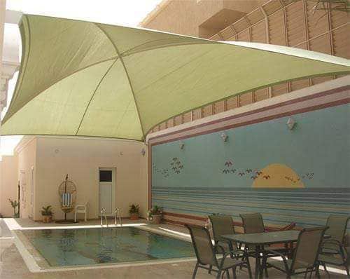 3- حرصنا عند قيامنا بتنفيذ مظلات المسابح أن يكون بها نسبة نفاذ جزئية للضوء، حيث أن المسابح على وجه الخصوص تحتاج لنفاذ الضوء إليها حتى لا تكون نسبة الحجب لضوء النهار كاملة.